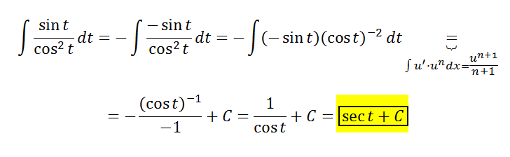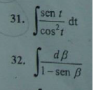 31) Plantea la sustitución: w = cost, de donde tienes: dw = - sent*dt, y luego tienes: - dw = sent*dt, suego sustituyes y te queda una integral directa: