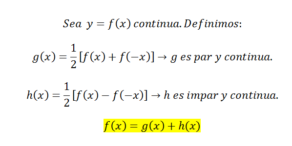 Probar que cada función f continua en R se puede escribir como f = E + O, donde E es par y continua y O es impar y continua.