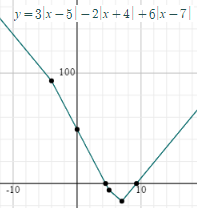 Sea f función R, definida por la fórmula f(x) = 3|x - 5| - 2|x + 4|+ 6|x - 7| y Dom(f) = [-10, 10]