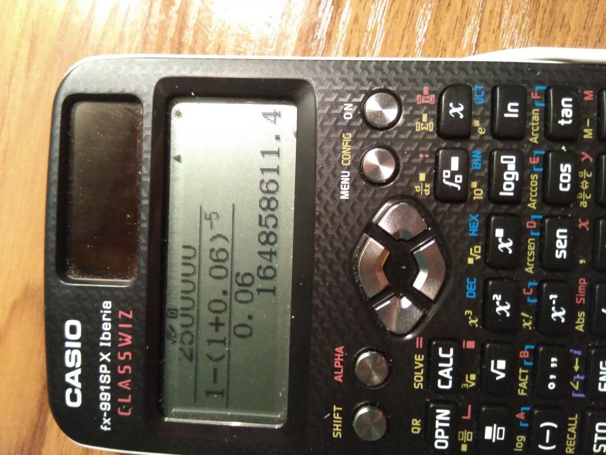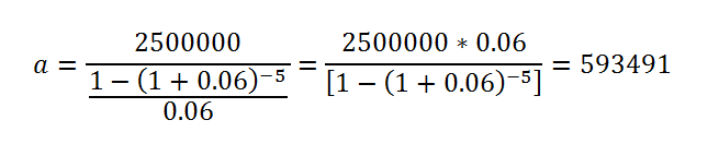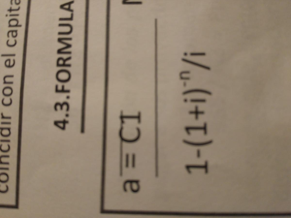Es un ejercicio de economía sobre préstamos el cual decía : construir el cuadro de amortización de un préstamo de 2500000 € , el cuál se cancelará con 5 anualidades iguales ( método francés). Tipo de interés 6%anual. Tenía que calcular la anualidad del año 1 que se calcula con esta fórmula ya dada en la imagen adjunta donde c1 sería los 250.000 , i el interés que es el 6% y n los años que son 5
