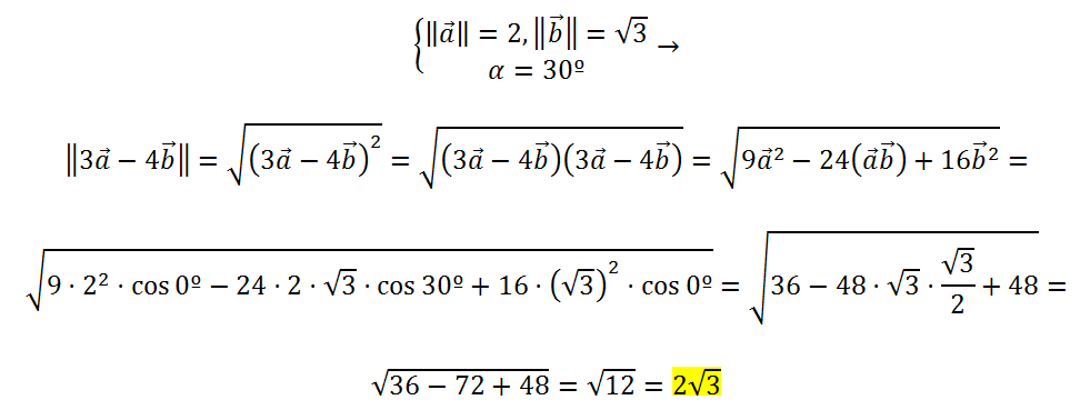 hola buenas tardes, tengo mañana examen de mates de 1º bachillerato y tengo duda con un problema, a ver si alguien me puede ayudar. Ahí va: Sabiendo que el módulo del vector a es =2 y el módulo del vector b es =√3 y el ángulo que forman ambos es igual a 30º. Calcula, utilizando las propiedades del producto escalar, el valor de l3a-4bl
