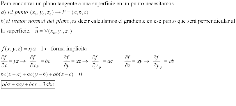 que es una ecuación cartesiana implícita del plano tangente a la superficie en el punto en estudio.