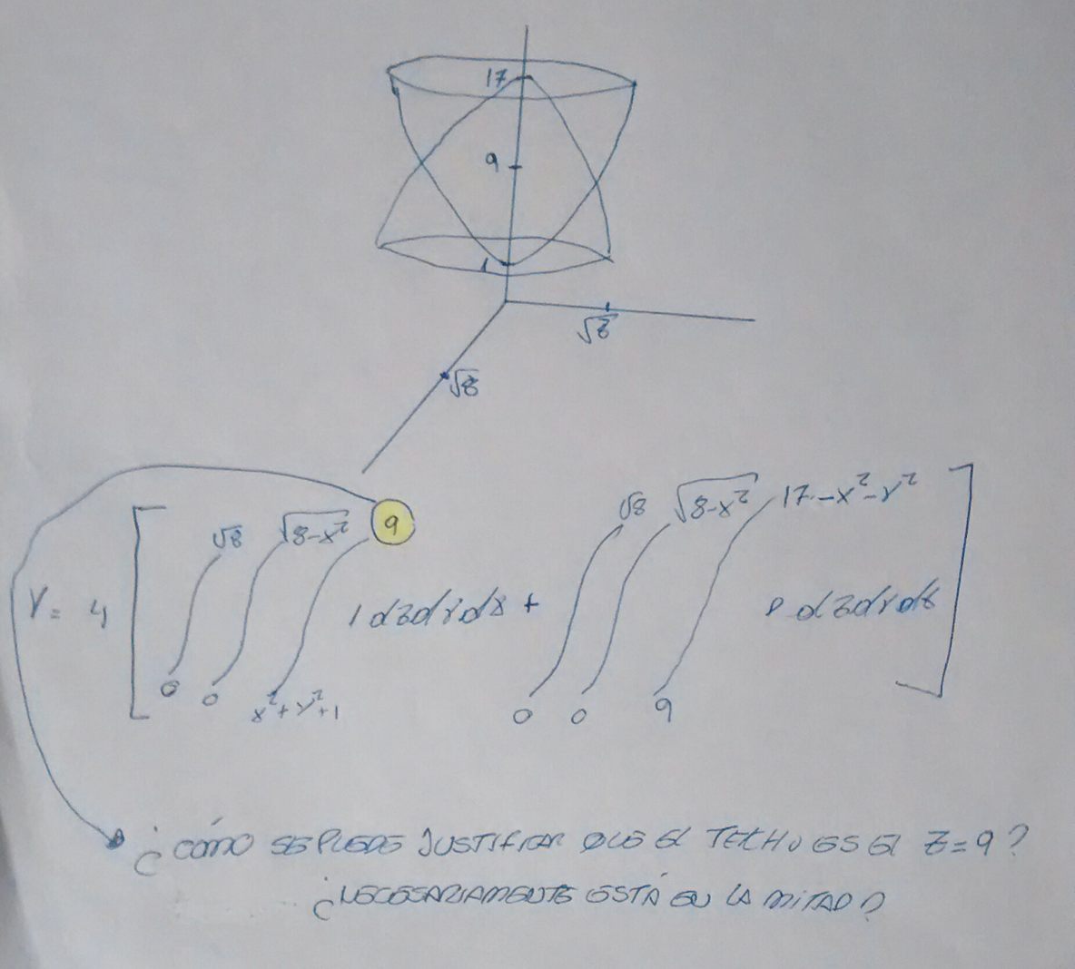 Yo la integral la se plantear y también desarrollar, lo que no se, es porque la integral en Z el techo es 9, en la otra integral seria el piso.