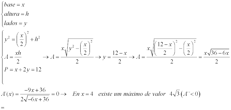 Holaa, me podéis ayudar con este problema porfaaa; De todos los triangulos isosceles de 12 cm de perimetro, halla las longitudes de los lados del que tenga área máxima. Gracias !!!