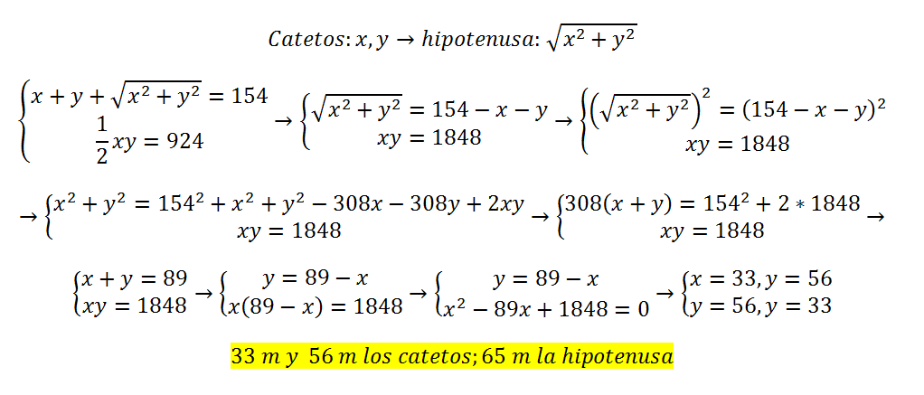Hola, solicito ayuda para resolver este ejercicio: Un triangulo rectangulo tiene un perimetro de 154m y un area de 924m2. calcular las dimensiones del triangulo.