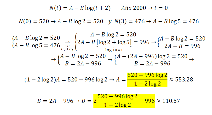 Un estudio de a policía rfleja que el número de robos en viviendas por año decrece según la función del tipo N (t) = A - B log(t+2). sabemos que en el año 2000 que es cuando se inició el estudio el número de robos fue 520, y que en el año 2003 fueron 476: