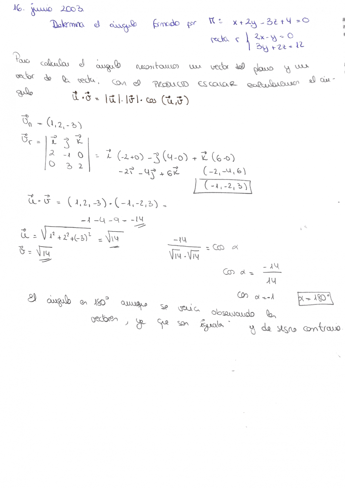 y observa también que el vector director de la recta es múltiplo escalar del vector normal al plano, ya que tienes: u = -2*n,