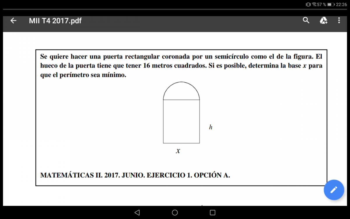 x = √( 128/(4+π) ), que es la longitud crítica de la base de la puerta;