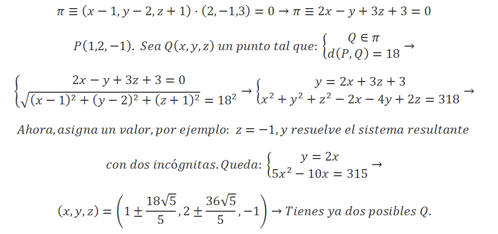 b) Dado el punto P = (1,2,−1) de Π encontrá otro punto de Π de manera que su distancia a P sea 18.