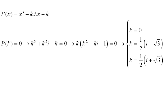 Buenas tardes, necesito ayuda con este problema de polinomios... gracias! "Existen al menos 2 valores de K ∈ ℛ para los cuales el polinomio "P(x)= x^3+k.i.x-k" tiene a "k" como raíz.