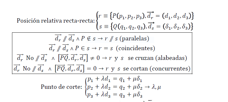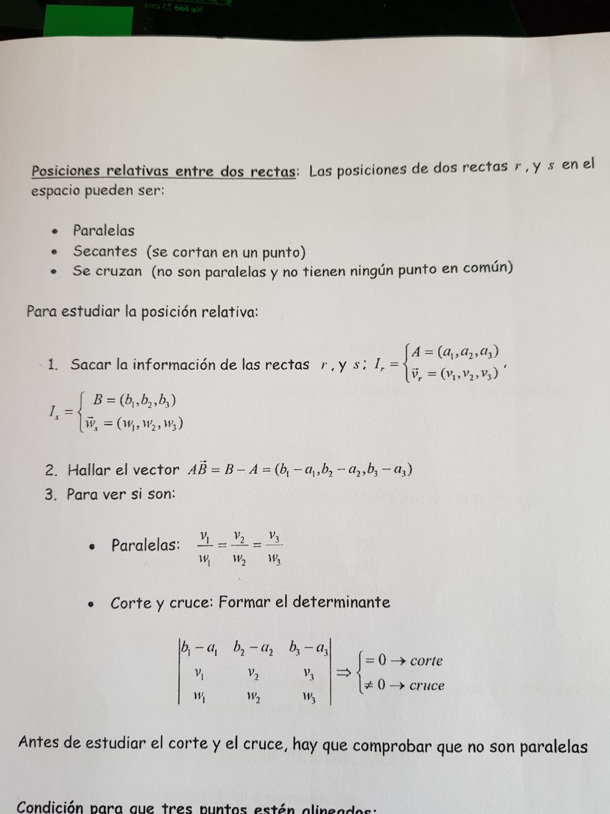 Hola compañeros, respecto al problema de hallas la posición relativa de dos rectas en r3 David lo hace mediante matrices y rangos.