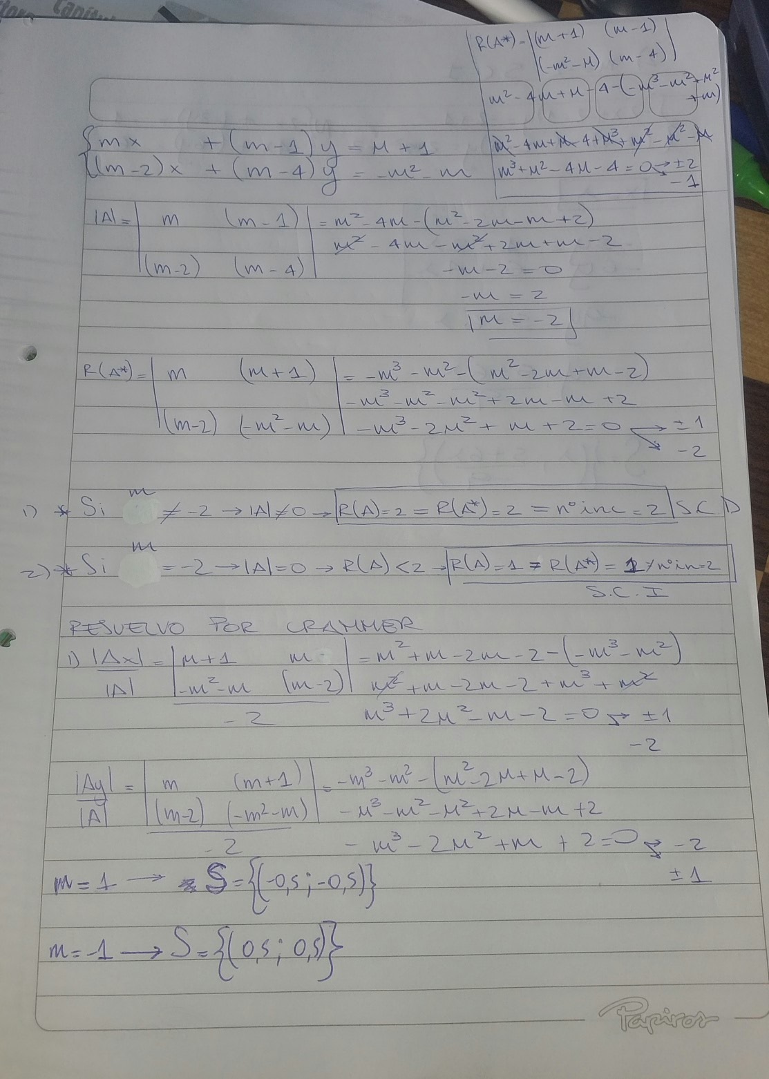 Por todo, lo más seguro es aplicar el Método de Gauss, y determinar el rango de la matriz y el rango de la matriz ampliada, para luego aplicar el Teorema de Rouché-Frobenius.
