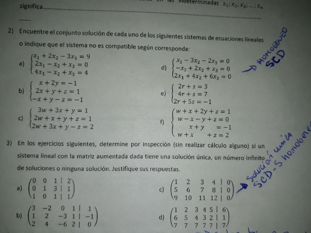 Hola, buenas a todos, ando necesitando una ayudita en Álgebra, en el punto 2 quisiera saber si hay una forma de saber si el sistema es SCD (Sistema compatible determinado), SCI(Sistema compatible indeterminado) o SI(Sistema incompatible) con solo verlo?