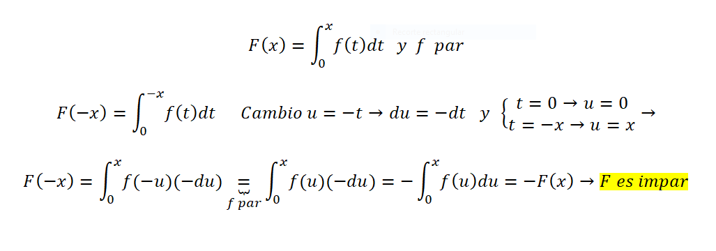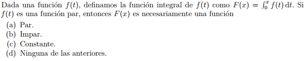 Hola muy buenas, me gustaría saber la explicación del siguiente ejercicio. Tengo entendido que F(X) siempre será una función impar, ya que al ser l'antiderivada de una función par, el área sera el mismo tanto por la izquierda como por la derecha, pero de signo inverso. Por lo tanto, escogería la opción b. La duda que tengo es si esto se cumplirá para todas las funciones pares, es decir, si no existirá alguna excepción para cuando la función sea discontinua o cualquier otra cosa.