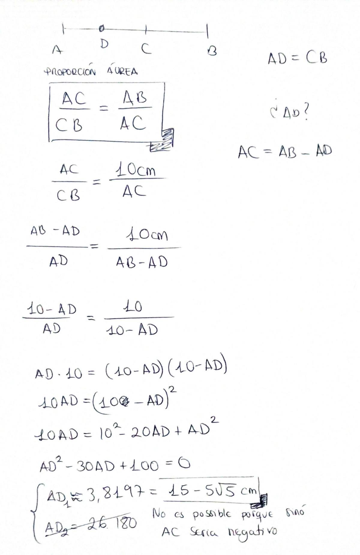 Un segmento AB=10cm, es dividido en media y extrema razón por un punto C. El punto D pertenece a AC y AD=CB. Si AB=10cm ¿Cuánto mide AD?