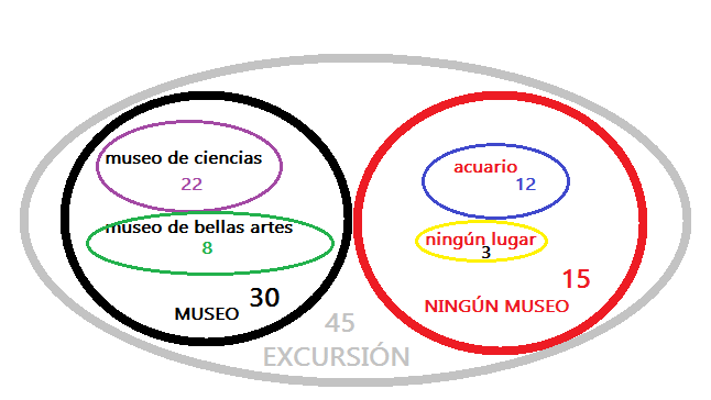 **También podriamos plantear directamente que de 45 estudiantes de la excursión, 30 fueron a museos (22+8) y los restantes no fueron a museos (45-30=15)