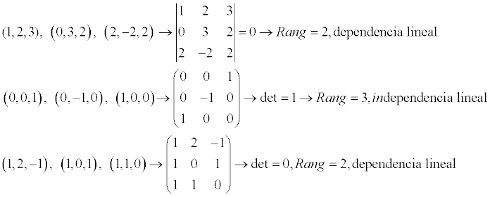 vectores (1,2,3), (0,3,2), (2,-2,2) 3 vectores---rango 2 Linealmente dependienties