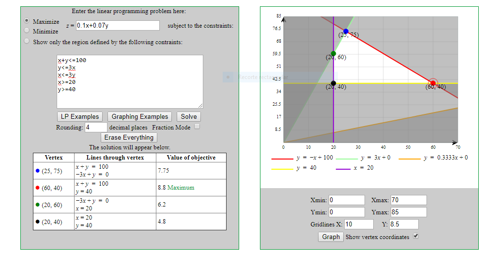 El consejo de dirección de cierta empresa desea invertir 100 millones de € en sus dos factorías A y B. Razones técnicas desaconsejan que la inversión en cualquiera de las factorias supere el triple de la que se realiza en la otra. Por otra parte, para conseguir subvenciones de la la UE, es necesario que la inversión en a A sea de al menos 20 millones y la inversión en B de al menos 40 millones. La rentabilidad esperada es del 10% para la inversión en A y del 7% para la inversión que se realice en B. Cuantifica la inversión que debe realizarse en cada factoría para maximizar la rentabilidad esperada respetando las restricciones planteadas.