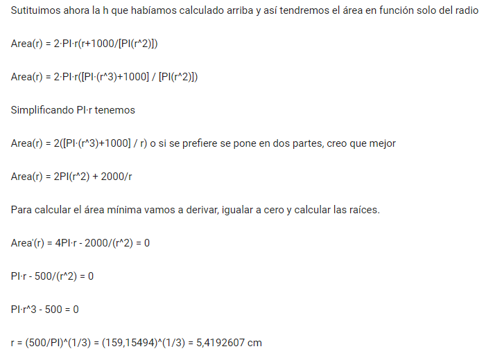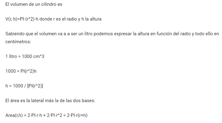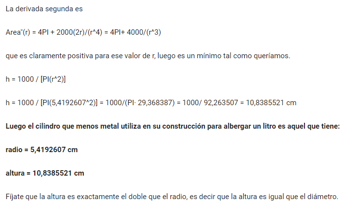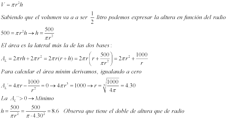 una lata de conservas, de forma cilíndrica, debe tener una capacidad de 500 ml. Determina sus dimensiones para que la cantidad de chapa utilizada sea mínima.