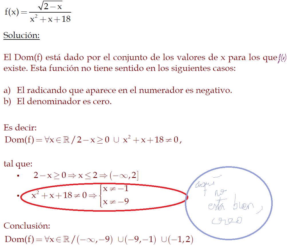 Como x2-2x+3 siempre será positivo en ℛ (observa que al hacer x2-2x+3=0 se obtienen valores negativos dentro de la raíz), tendremos que descartar los valores negativos de x porque el denominador se haría negativo y positivo÷negativo es negativo y también el cero (por indeterminar la función de dentro del ln) ; por lo que Dominio f(x) = (0,inf)