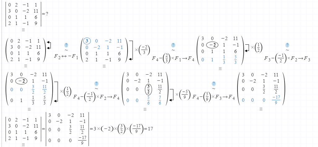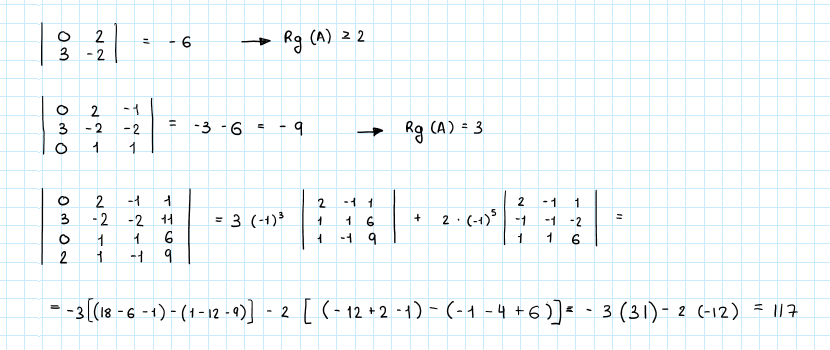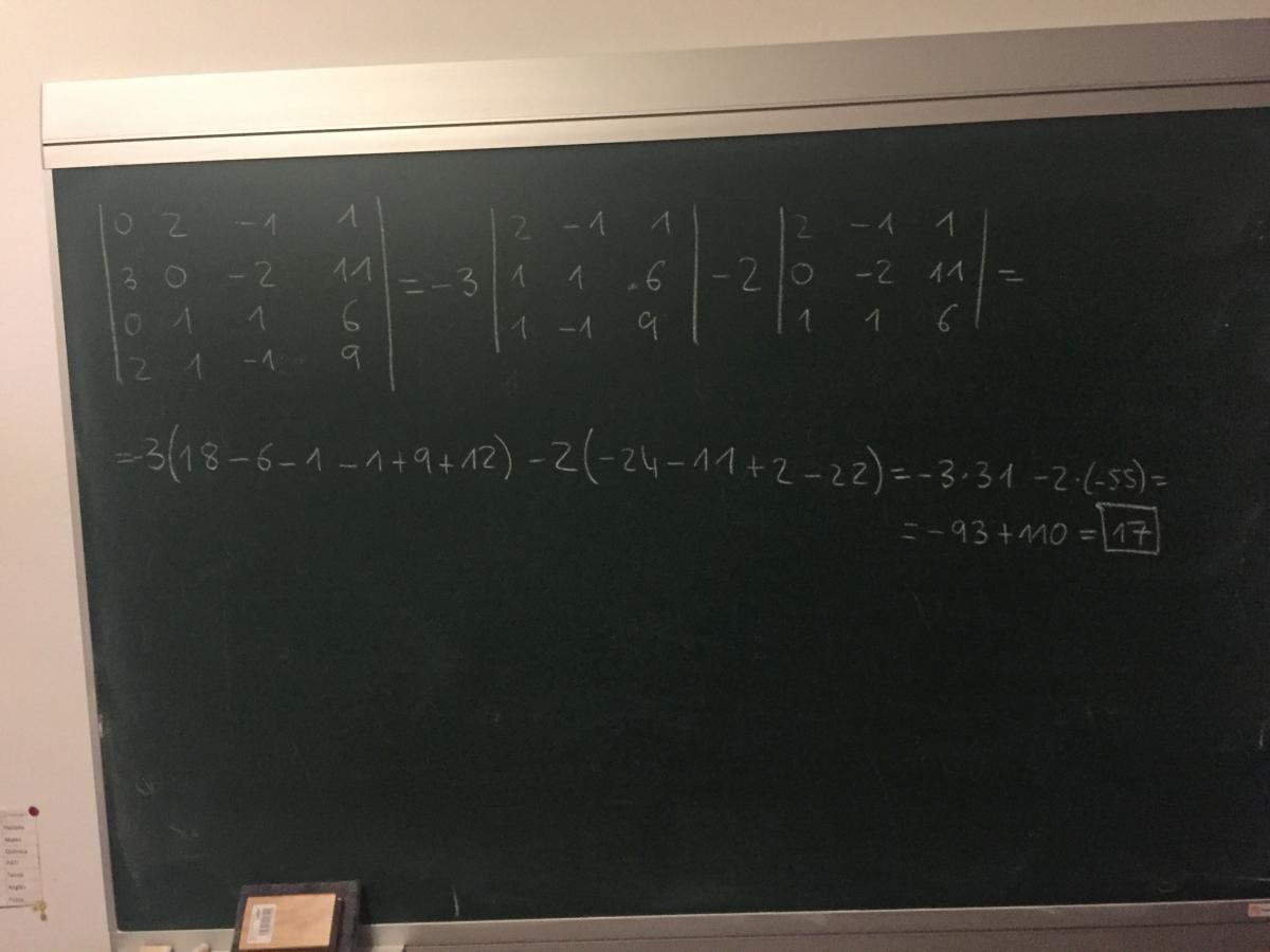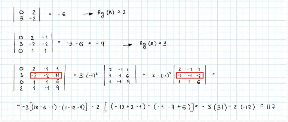 Buenas tardes, me gustaría pediros si me sabriais decir por qué la matriz ampliada da como resultado 17, ya que lo he intentado varias veces y me daba como resultado distintos números. ¿El resultado depende de como simplifiquemos la matriz para lograr que tenga más ceros o debe dar siempre lo mismo? Muchas gracias.
