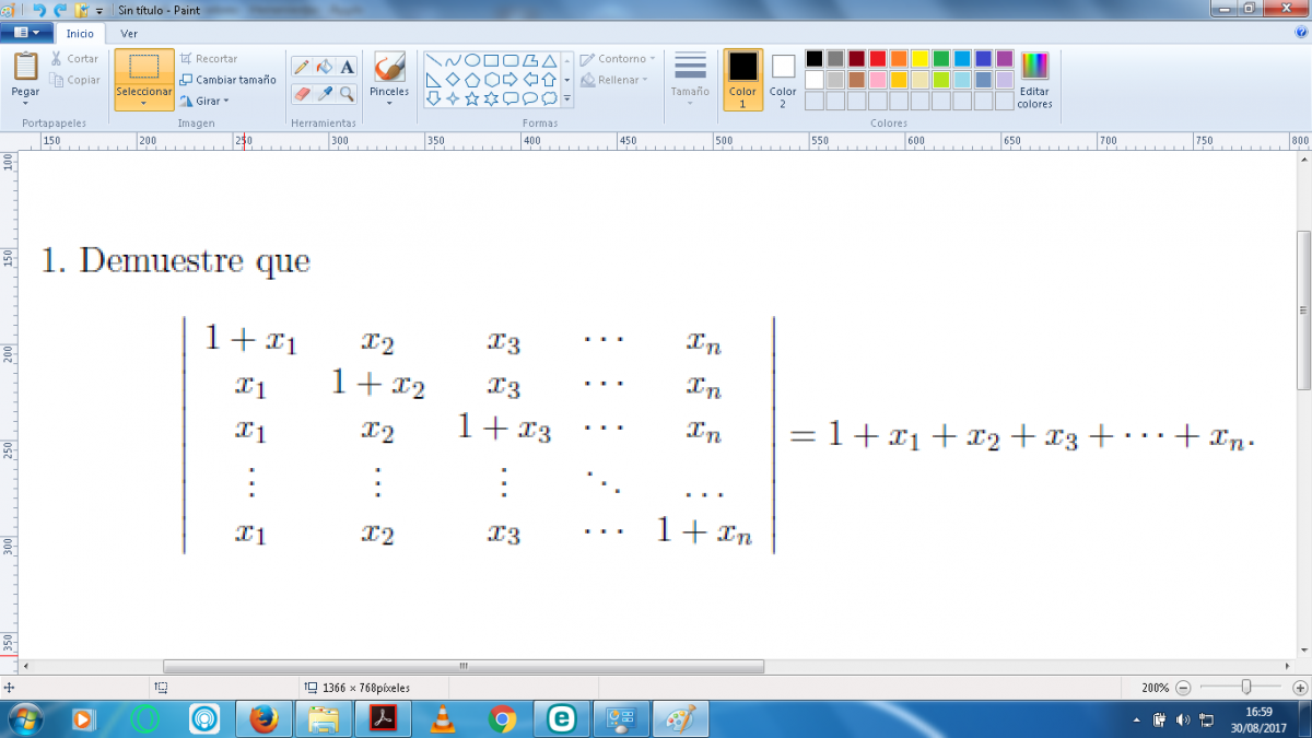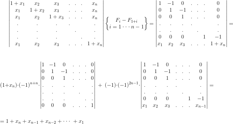 Juan lo que hice fue restarle a cada fila la siguiente, quedando como ves en la imagen. Después, aprovechando que hay una columna entera de ceros excepto los dos últimos elementos de ésta (-1 y 1+xi), resuelvo el determinante por adjuntos en esa columna, teniendo pues que calcular los dos determinantes asociados a los dos elementos ya que el resto son ceros. Si te das cuenta el determinante asociado al elemento 1+xi es triangular superior y se resuelve multiplicando los elementos de la diagonal principal, el otro determinante es como el primero así que tendrás que volver a resolverlo por adjuntos, etc.
