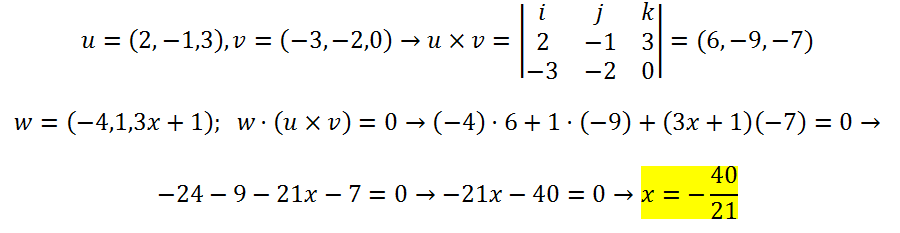 Hallar, si existen, valores de x para que w.(u x v)=0