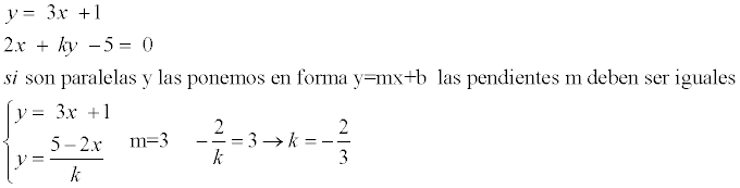 Calcula k para q las rectas y= 3x +1, 2x + ky -5= 0 sean paralelas.