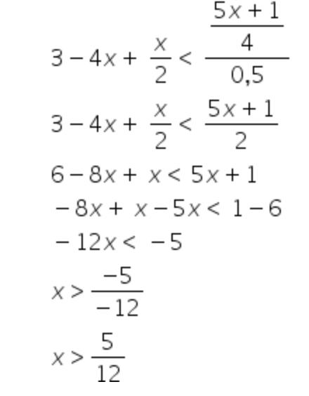 Hola Unicoos. No me sale la siguiente inecuación. 3-4x+ (x/2) < ((5x+1)/4)/0,5