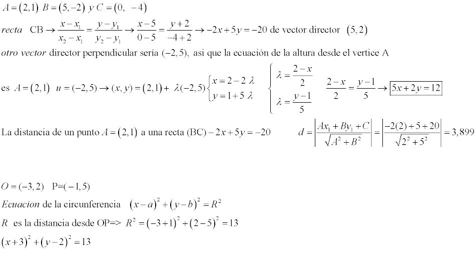 a) Observa que la recta que contiene a la altura (H) pasa por el punto A(2,1) y es perpendicular a la recta que pasa por los puntos B y C, cuya pendiente es: