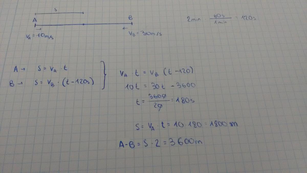 Dos móviles parten al encuentro desde los extremos del trayecto A-B con velocidades V1=10m/s y V2=30 m/s ,el móvil que parte de B lo hace 2 minutos después que el otro,y el encuentro se produce en el punto medio de A-B,
