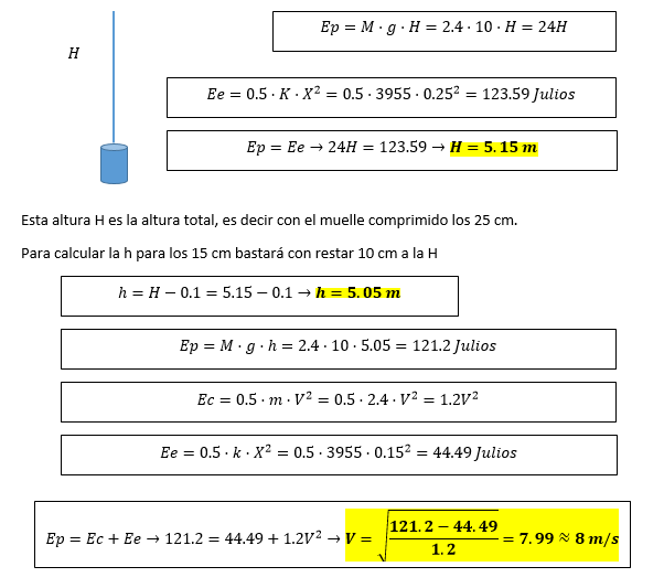 Un bloque de 2'4 kg se lanza desde una altura de metros sobre un muelle cuya constante de fuerza es 3955 N/m. Cuando el bloque que alcanza momentáneamente el reposo, el muelle se ha comprimido 25 cm. Determina la velocidad cuando la compresión del muelle son 15 cm