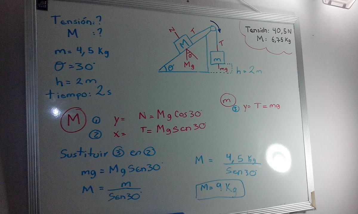 Sustituyendo en (1) tenemos. 45-5M=1·M+4.5·1→45-4.5=6M→M=40.5/6=6.75 kg