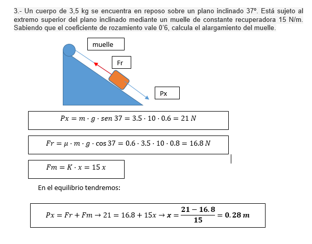 3.- Un cuerpo de 3,5 kg se encuentra en reposo sobre un plano inclinado 37º. Está sujeto al extremo superior del plano inclinado mediante un muelle de constante recuperadora 15 N/m. Sabiendo que el coeficiente de rozamiento vale 0’6, calcula el alargamiento del muelle.