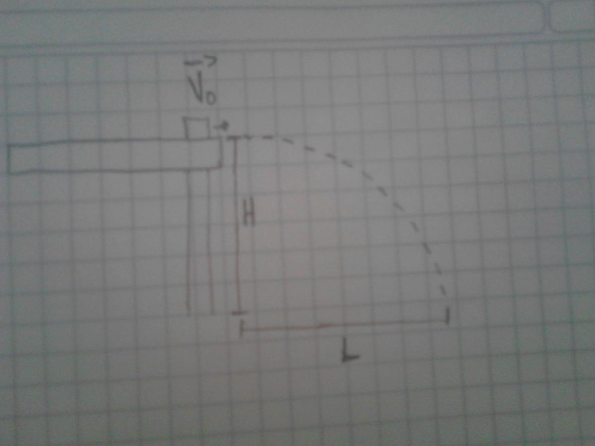 Hola, me podran ayudar con este problema. Un bloque sale de la mesa moviendose en forma horizontal con velocidad constante Vo=Vo i (m/s). Cuando la particula abandona la mesa desciende una altura H (m), justo antes de tocar el piso, a una distancia L(m) desde el borde de la mesa. Hallar: