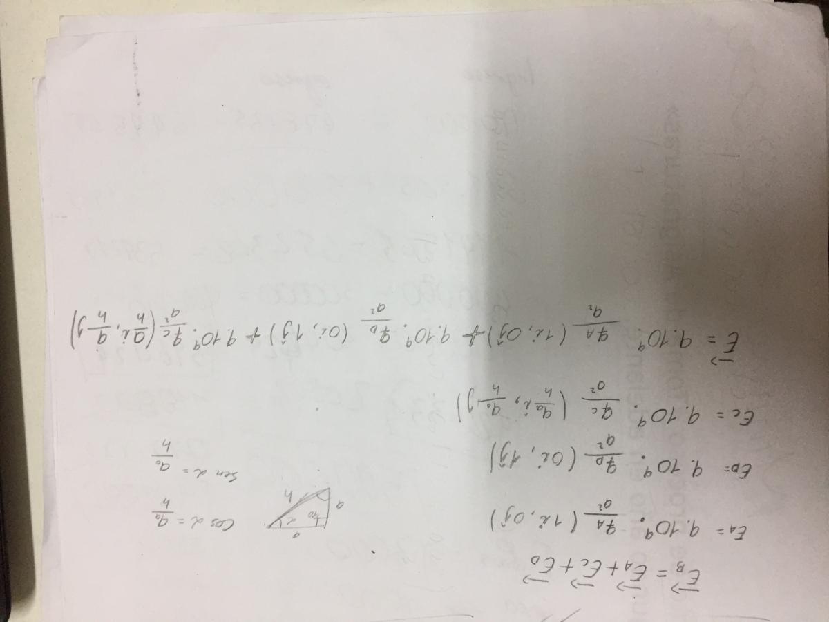 Oscar, lo que veo en la imagen pareciera ser cálculos de Potencial Eléctrico, no de Fuerzas. Mucho cuidado, no son lo mismo. Te repito, la fuerza electrostática y el campo eléctrico se relacionan directamente con la ecuación que mencionaste. La carga puesta en un punto donde queramos hallar algo (fuerza electrostática o campo eléctrico) se le conoce como carga de prueba. Si obtienes la fuerza electrostática en un punto, para saber el campo eléctrico en ese punto solo divide entre el valor de la carga de prueba en dicho punto. En caso contrario, si obtienes el campo eléctrico en un punto, para saber la fuerza electrostática en ese punto, multiplicas por el valor de la carga de prueba en dicho punto. Esto último fue lo que hice para desarrollar el problema. Otra cosa importante es el sentido que tendrán la fuerza electrostática y el campo eléctrico dependiendo de la naturaleza de la carga de prueba. Si la carga de prueba es positiva, la fuerza y el campo van en el mismo sentido. Si la carga de prueba es negativa, la fuerza y el campo van en sentido contrario. Esto es básicamente lo esencial para resolver este problema. Me cuentas si aclare o empeore la situación…