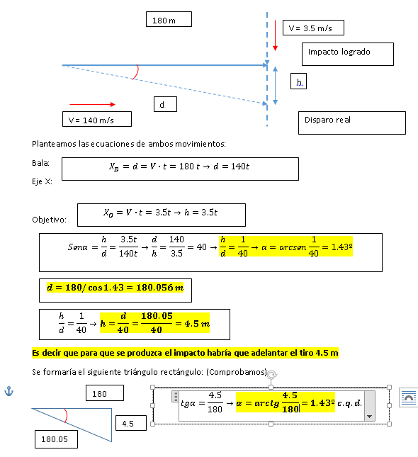 En una prueba de tiro al blanco móvil con fusil, un competidor en reposo apunta al objetivo que se ubica a 180,00 m de distancia medida en horizontal y que se encuentra en movimiento normal al eje del fusil con una rapidez de 3,50 m / s. Siendo la rapidez de la bala de 140,00 m / s, determinar: a) el ángulo medido en horizontal que deberá existir entre la dirección del fusil y la del objetivo.