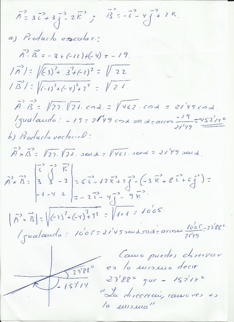 Si por ejemplo me piden calcular el angulo pero no me dicen por cual producto y uso el escalar ( A.B=ABcos(x) ese deberia de ser igual al del obtenido por el producto vectorial l AxBl= ABsen(x)