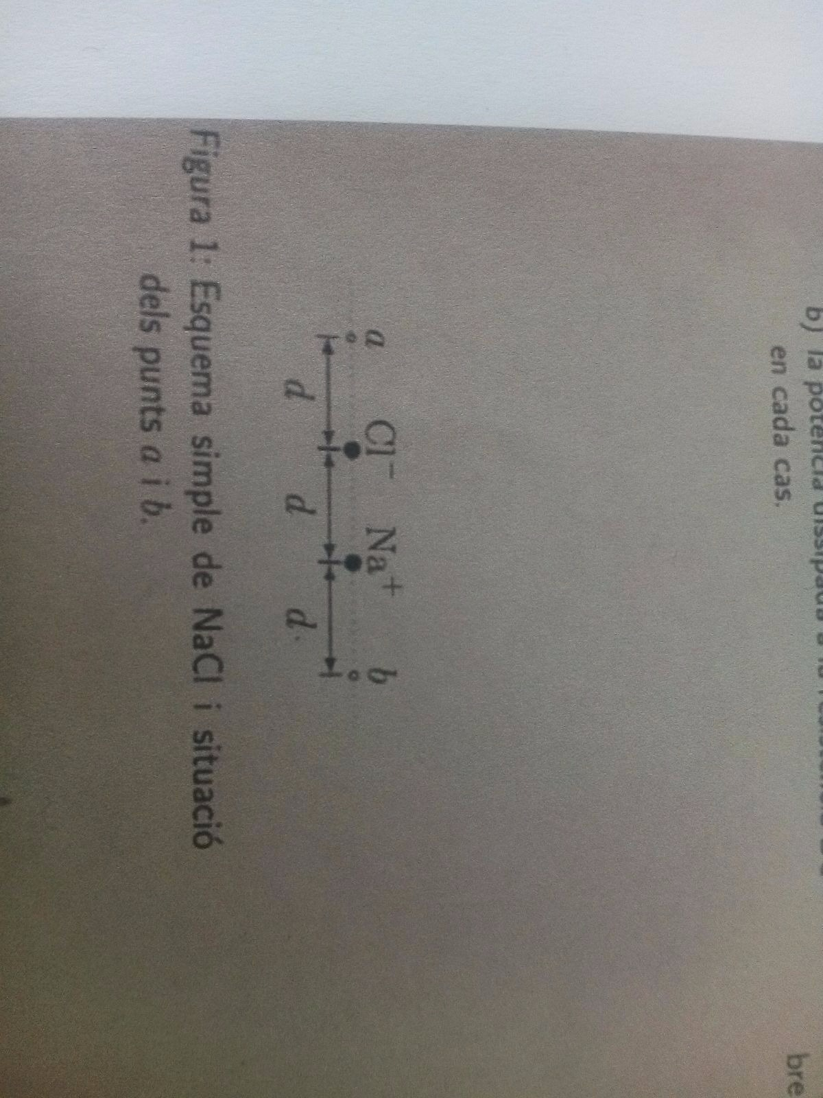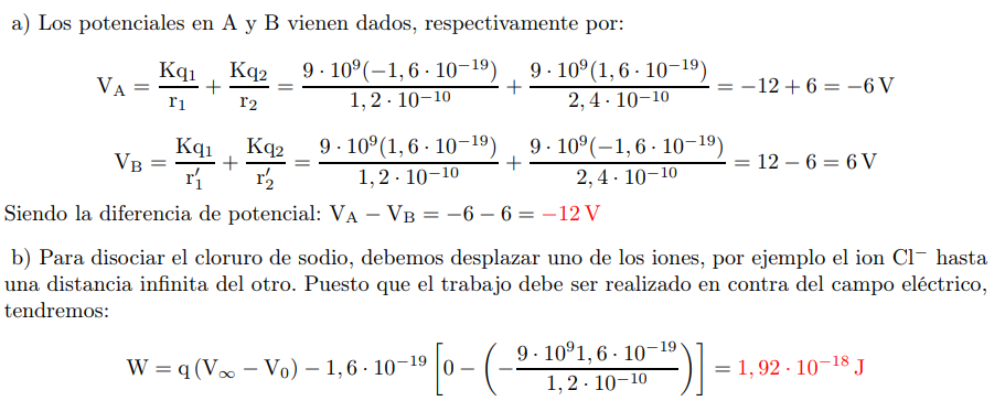 Tengo el siguiente problema: En un modelo simple de cloruro de sodio podemos considerar los iones cloruro y de sodio como cargas puntuales de valores -1,60·10^-19 C y 1,60·10^-19 C. Estas cargas se encuentran separadas por una distancia de 1,20·10^-10m. Calcular: