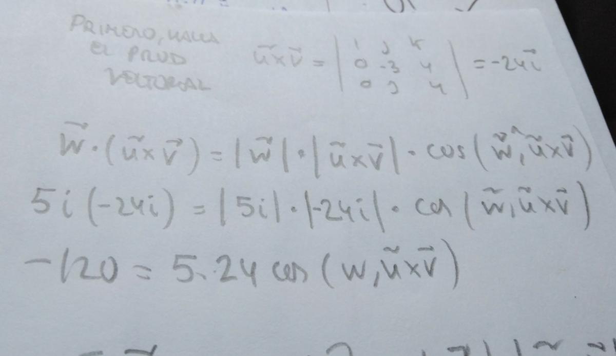 Luego, planteas la expresión del producto escalar en función de las componentes entre el vector w y el vector obtenido en el producto vectorial, y queda: