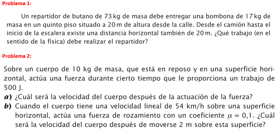 Pero, por contra, en el problema 2 se dice lo contrario: que si hay trabajo, e incluso la dan en el enunciado (500 J) como dato para hallar la velocidad. En este problema 2 el peso también actua en dirección vertical y el desplazamiento es horizontal, según la fórmula del trabajo (W=F·X·cosa) este debería dar 0, exactamente igual que en el problema 1.
