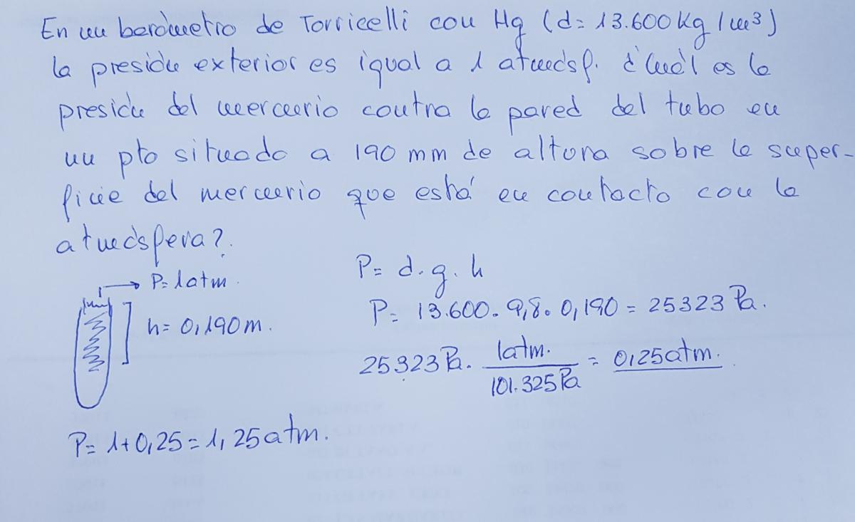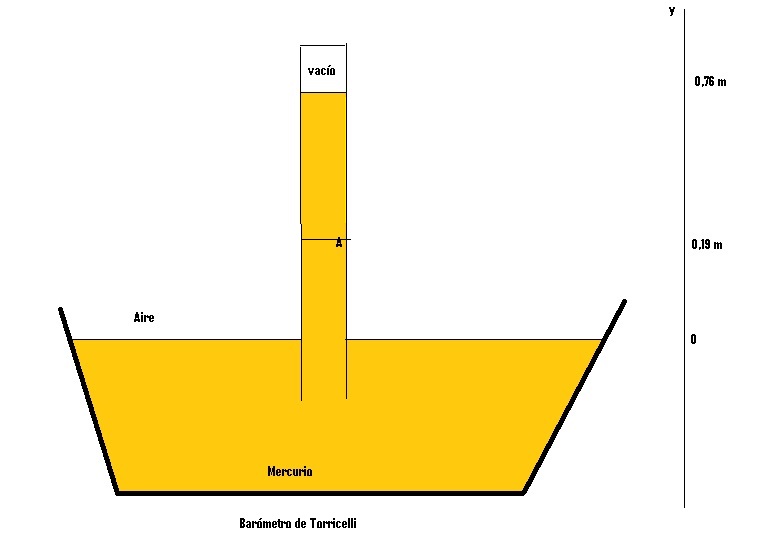 Luego, observa que el nivel superior de la columna de mercurio se encuentra a 0,76 m, y que el nivel correspondiente al punto A es 0,19 m, por lo que la altura de la columna de mercurio "por encima" del nivel del punto A es: