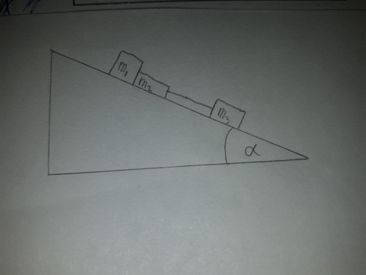Sobre un plano inclinado se encuentran apoyados tres cuerpos de masa m1=1kg, m2=5kg, m3=2kg respectivamente. El cuerpo 1 se encuentra apoyado sobre el cuerpo 2 y el cuerpo 3 se mantiene unido al cuerpo 2 a través de una cuerda de masa despreciable e inextensible. Solo existe rozamiento entre el cuerpo 2 y la superficie del plano inclinado (μe=0,2 μd=0,1).