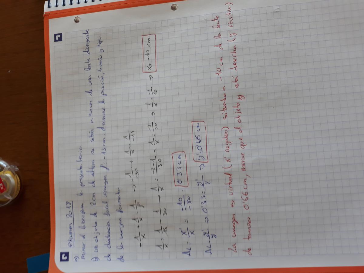 1/x' - 1/30 = -1/(-15), de aquí despejas: 1/x'= 1/10, y luego despejas: x' = 10 cm,