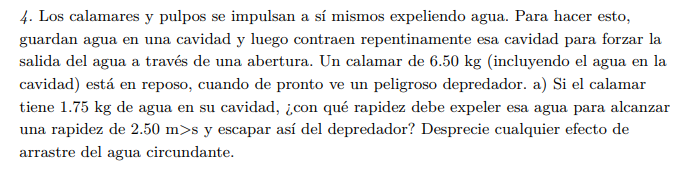 Luego, como no actúan fuerzas exteriores en la dirección de desplazamiento del calamar y de la masa de agua, planteas conservación del impulso, y tienes la ecuación: