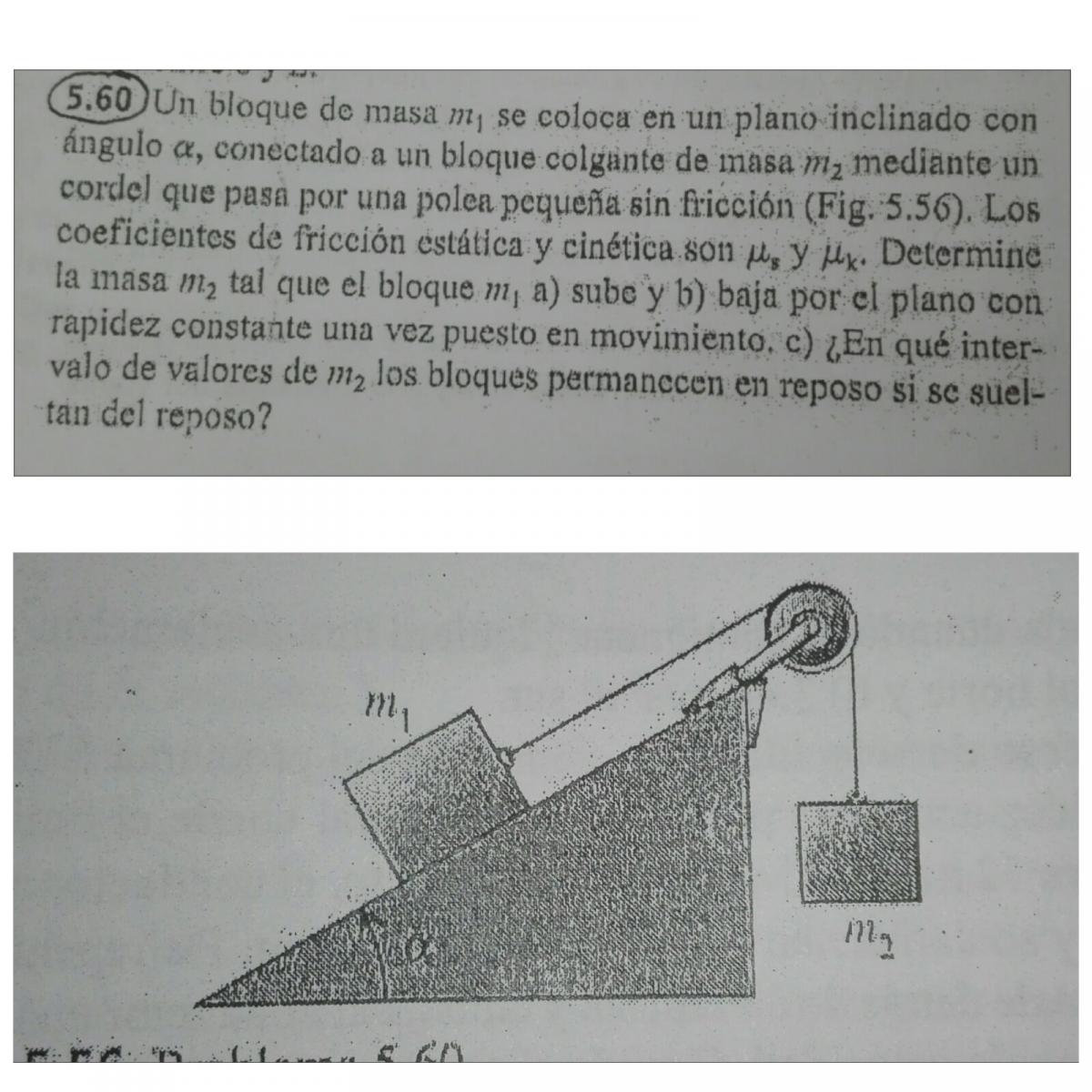 Consideramos que el sistema está en reposo, pero ante una pequeña disminución de la masa M1 (por ejemplo, si se desprende polvo desde sus caras) el bloque apoyado sobre el plano tiende a subir.
