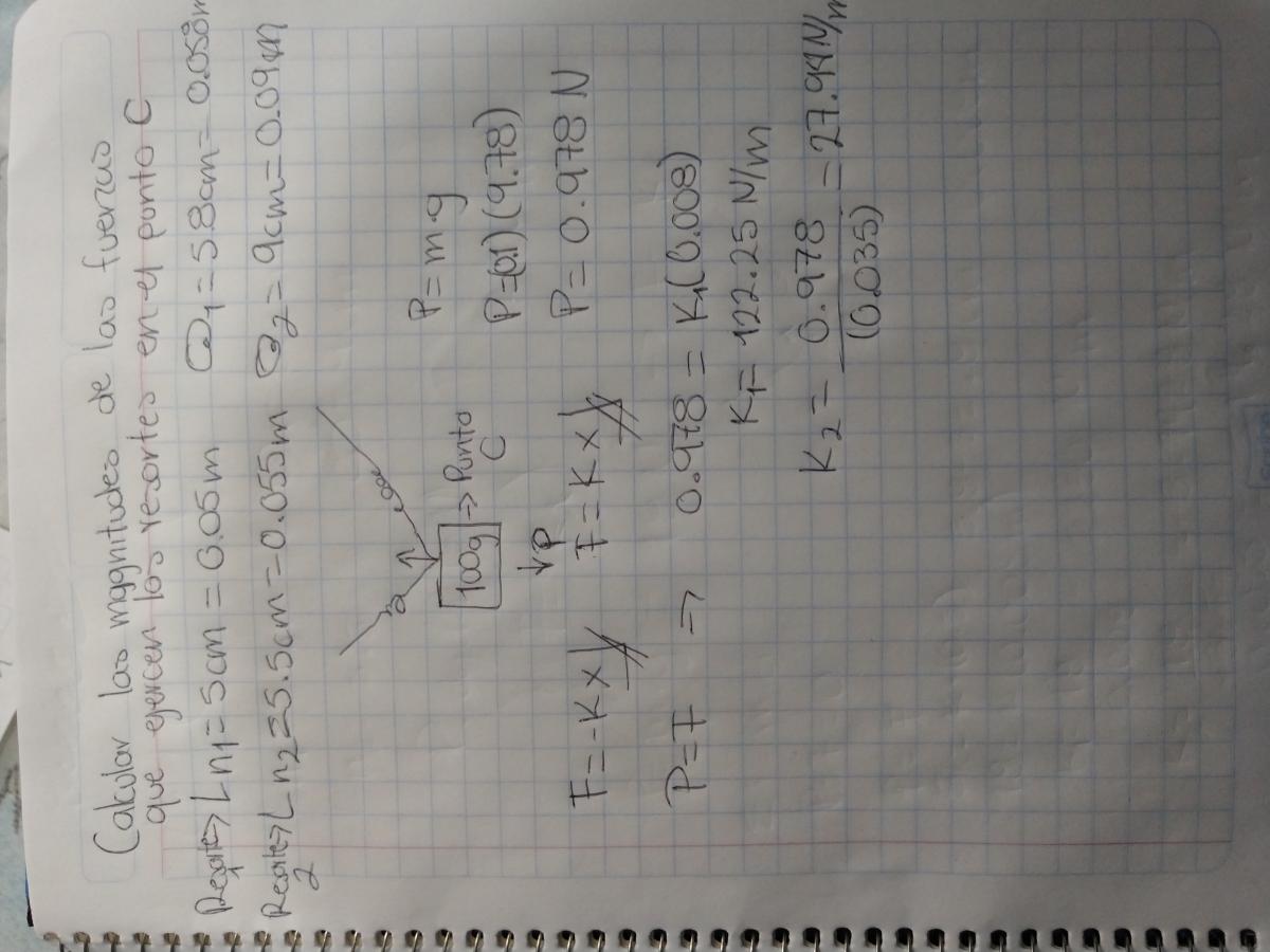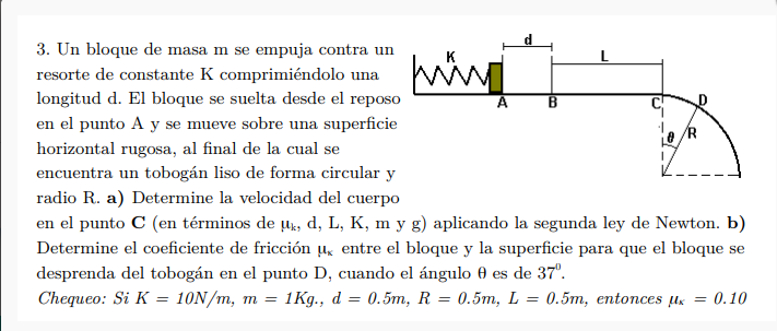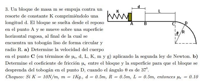 Observa que hemos considerado que la superficie ubicada entre los puntos A y C es rugosa, por lo que no hemos planteado las ecuaciones de la Segunda Ley de Newton porque entre los puntos A y B tienes que la fuerza ejercida por el resorte sobre el bloque es variable, lo que conduciría a una ecuación diferencial. Por favor, consulta con tus docentes a este respecto.