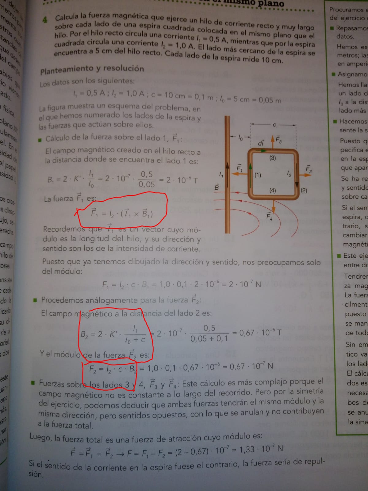 Buenas noches héroes, que diga unicoos. Tengo dudas muy concretas de dos ejercicios y ojalá puedan ayudarme :(. En el ejercicio 4 no entiendo lo encuadrado el porque F1=I2(l1xB1) Lo que no entiendo es porque es I2 y además posteriormente en su módulo su longitud es c que es lo que mide el lado de la espira, también posteriormente en F2 usa I2 y no logro entender el porque en ese caso se usa la intensidad del otro objeto para la Fm. No sé si he logrado explicarme pero ojalá que si y puedan ayudarme 🙏.