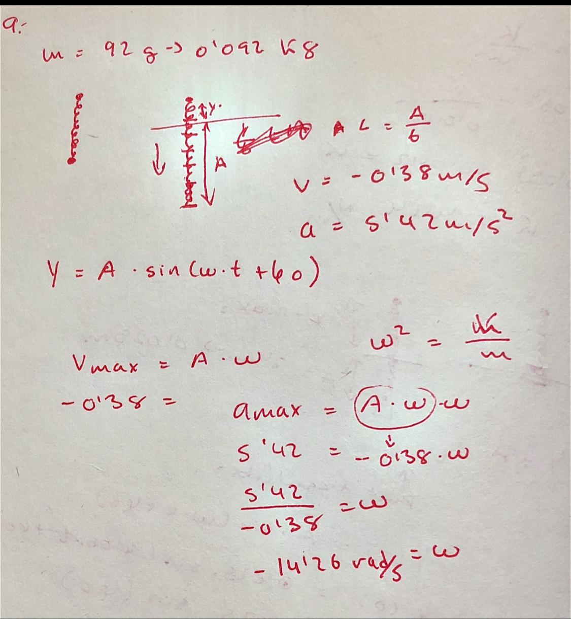 hola! buenas noches, tengo otra pregunta sobre movimiento armonico simple , en este caso me pise hallar la ecuacion posicion, velocidad y aceleracion, pero al intentar calcular la "w" no me sale el resultado que pone en mi libro