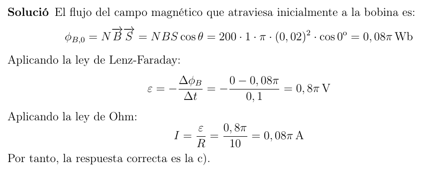Buenas tardes, por favor si me pueden ayudar se lo agradezco. Tengo un ejercicio que dice: Una bobina circular formada por 200 espiras de 2cm de radio y 10 ohmios de resistencia se encuentra situada perpendicular a un campo magnético de 1 T. Si el campo magnético se anula a los 0,1 s, la corriente inducida en la espira es: